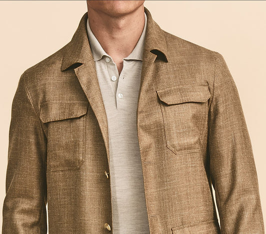 Biege Herringbone Shirt Jacket in Wool-Silk-Linen Blend